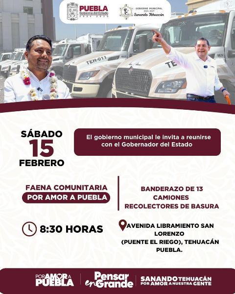 Tehuacán, Pue.- Febrero 14 del 2025.- El Gobierno Municipal y el Gobierno del Estado de Puebla les invitan a un importante evento este sábado 15 de febrero.