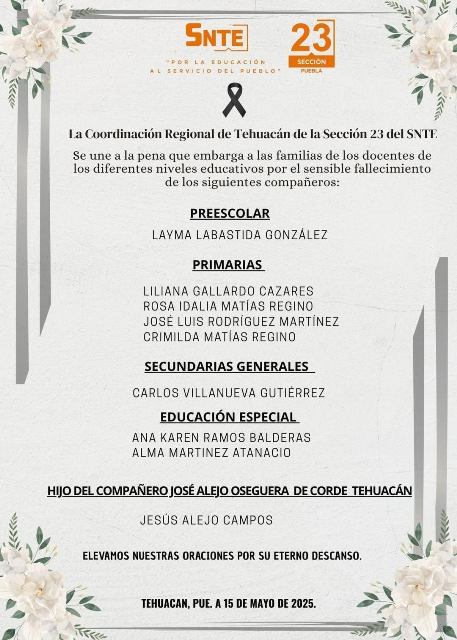 PUEBLA.-Mayo 15 del 2025.-El Sindicato Nacional de Trabajadores de la Educación (SNTE) Sección 23 confirmó con profundo pesar el fallecimiento de ocho docentes y el hijo de un trabajador de la CORDE 10 de Tehuacán, como resultado del trágico accidente ocurrido el pasado 14 de mayo en la supercarretera Cuacnopalan-Oaxaca, el cual dejó un saldo de 21 personas muertas.