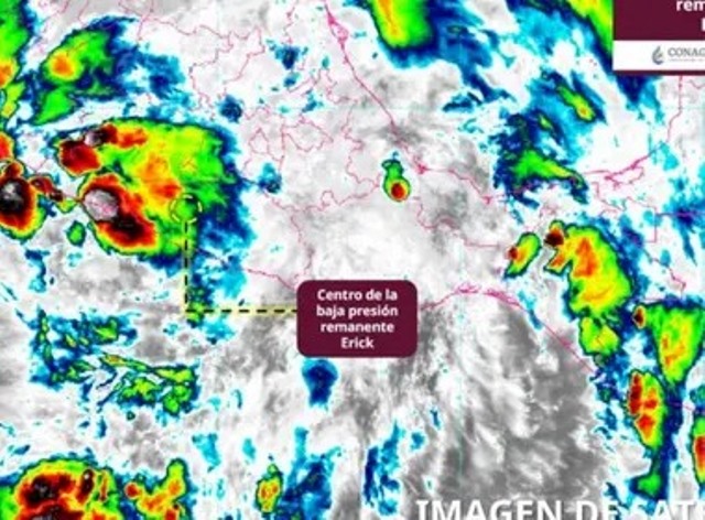 “Erick” permanece en tierra, sobre Guerrero, pero ahora como baja presión remanente, informó el Servicio Meteorológico Nacional (SMN).