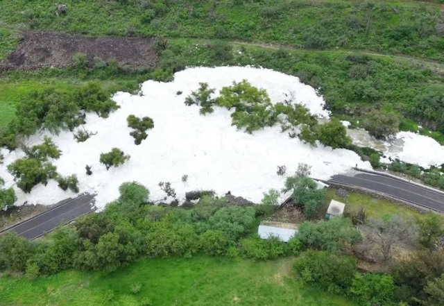 Desde el aire, parece que una nube estuviera sobre el pavimento, ya en tierra, al acercarte, aparenta ser espuma creada con jabón e incluso con shampoo, pero en realidad, se trata de espuma tóxica que invade más de 100 metros de longitud la carretera Alfajayucan-Chilcuautla en la comunidad La Cañada de Alfajayucan, Hidalgo.
