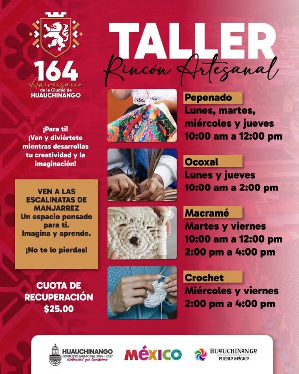 HUAUCHINANGO.-Julio 8 del 2025.- Como parte del 164 Aniversario de la Ciudad de Huauchinango, te invitamos a participar en los talleres que preparamos para ti en un espacio lleno de tradición, cultura y talento local.