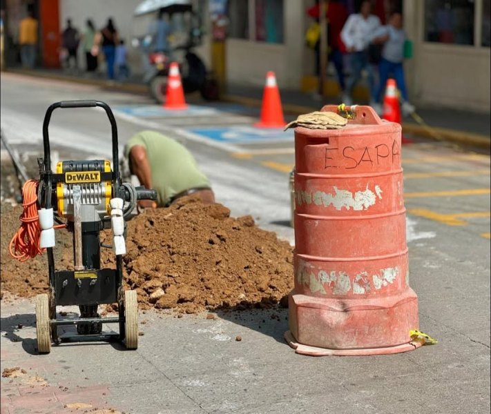 HUAUCHINANGO.-Julio 8 del 2025.-Personal de #ESAPAH lleva a cabo trabajos de reparación por fuga de agua en la calle Juárez, por lo que el área de parquímetros para motocicletas permanecerá inhabilitada hasta el viernes 11 de julio, permitiendo la circulación vial.
