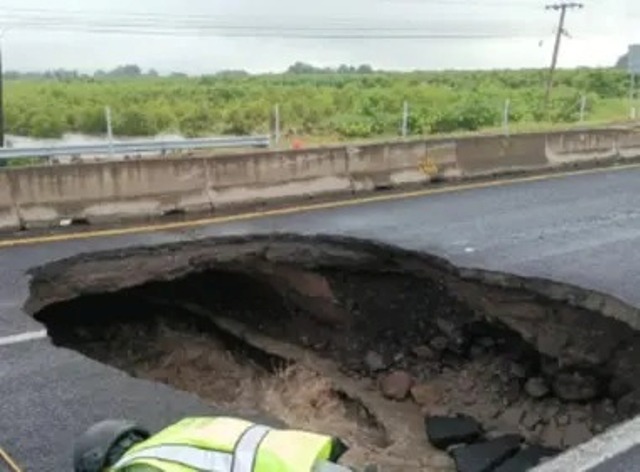 El socavón abarca dos carriles de la carretera, pero elementos de la Guardia Nacional cerraron ambos sentidos para evitar algún accidente.