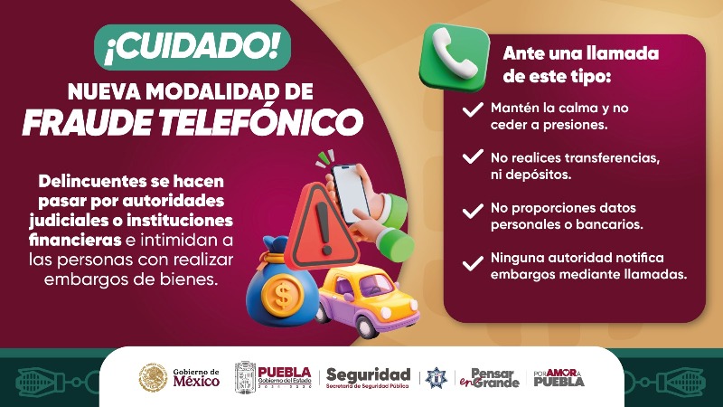 CIUDAD DE PUEBLA, Pue.- Septiembre 24 del 2025.-El Gobierno del Estado de Puebla, a través de la Secretaría de Seguridad Pública (SSP), emite medidas para prevenir a la ciudadanía sobre una nueva modalidad de fraude telefónico, en la que delincuentes se hacen pasar por autoridades judiciales o instituciones financieras para intimidar a las personas con embargos de bienes.