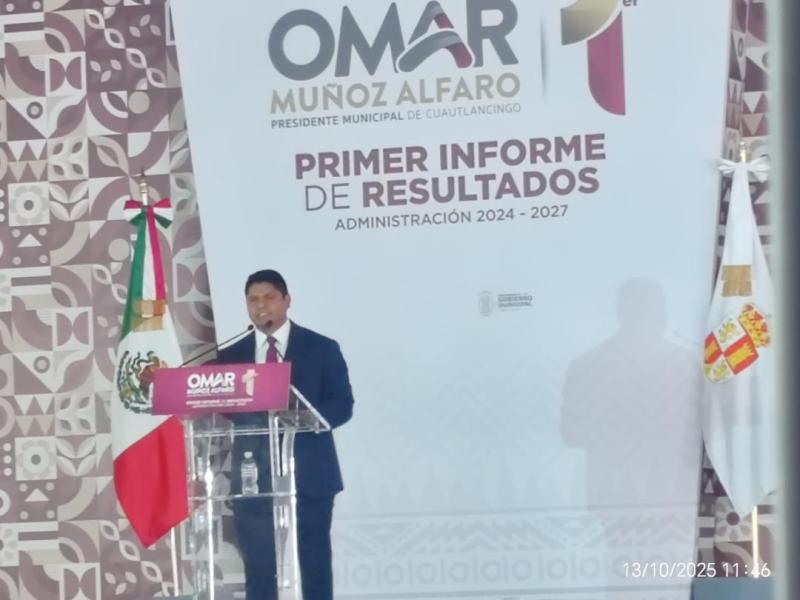 CUAUTLANCINGO.-Octubre 13 del 2025.-En el marco de su Primer Informe de Gobierno, Omar Muñoz Alfaro expuso los avances y objetivos de su administración delante de la ciudadanía de Cuautlancingo, con un discurso centrado en la transformación como eje rector de su gestión.