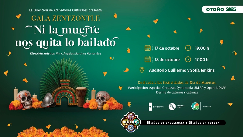 Cholula, Puebla; a 13 de octubre de 2025.- Con la participación de 19 bailarines en escena acompañados por la colaboración especial de la Orquesta Symphonia y de dos cantantes de Ópera UDLAP, Ni la muerte nos quita lo bailado, la gala de Zentzontle, Equipo Representativo de la Universidad de las Américas Puebla, promete ser un espectáculo lleno de color, música y tradición que rinde homenaje a una de las celebraciones más representativas de México: el Día de Muertos.