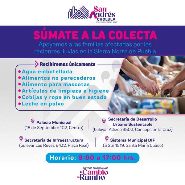 SAN ANDRÉS CHOLULA.-Octubre 15 del 2025.-El Gobierno Municipal de San Andrés Cholula invita a la ciudadanía a solidarizarse con las familias afectadas por las recientes lluvias en la Sierra Norte de Puebla, mediante la donación de alimentos no perecederos, artículos de higiene personal y ropa en buen estado.