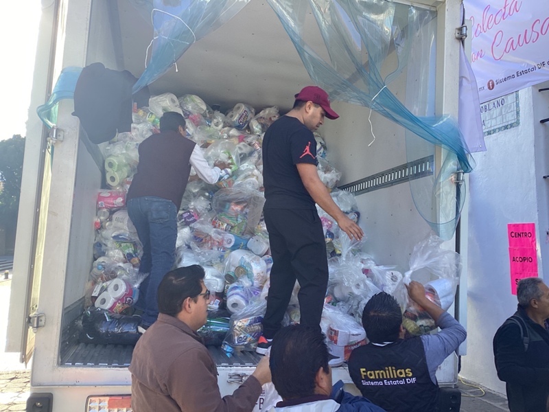CIUDAD DE PUEBLA, Pue.- Octubre 15 del 2025.-Desde el centro de acopio, el Sistema Estatal para el Desarrollo Integral de la Familia (SEDIF) informa que en las últimas 24 horas salieron dos camiones con víveres y productos de primera necesidad, como despensas, papel higiénico, ropa, zapatos, artículos de higiene personal y de limpieza para las y los damnificados de la Sierra Norte.