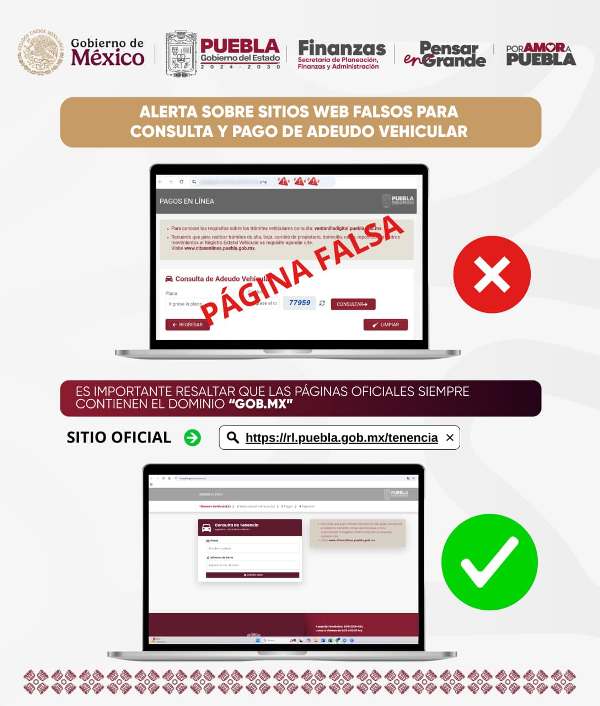 CIUDAD DE PUEBLA, Pue.-Octubre 22 del 2025.- El Gobierno del Estado de Puebla, a través de la Secretaría de Planeación, Finanzas y Administración, alerta a las y los contribuyentes sobre la existencia de una página que suplanta un sitio oficial para realizar el pago de las contribuciones vehiculares, con medios y lugares de pago no establecidos por esta dependencia.
