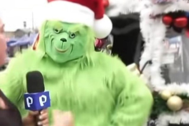 Vestido de verde como el Grinch, Jeferson Castro no sale a las calles para robar regalos, sino para repartir sonrisas.Captura de video