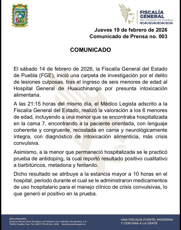 PUEBLA.-Febrero 19 del 2026.-El sábado 14 de febrero de 2026, la Fiscalía General del Estado de Puebla (FGE), inició una carpeta de investigación por el delito de lesiones culposas, tras el ingreso de seis menores de edad al Hospital General de Huauchinango por presunta intoxicación alimentaria.