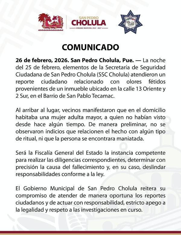 San Pedro Cholula, Pue. —Febrero 26 del 2026.- La noche del 25 de febrero, elementos…
