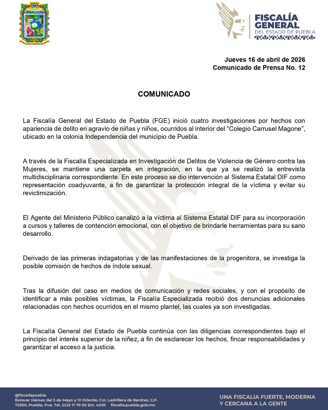 PUEBLA.-Abril 16 del 2026.-La Fiscalía General del Estado de Puebla informó el inicio de cuatro…