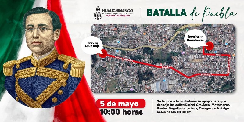 HUAUCHINANGO.-Abril 20 del 2026.- Te invitamos a ser parte de este importante Desfile Cívico en conmemoración al 164 Aniversario de la Batalla de Puebla, recordando el valor y la identidad de nuestro país.